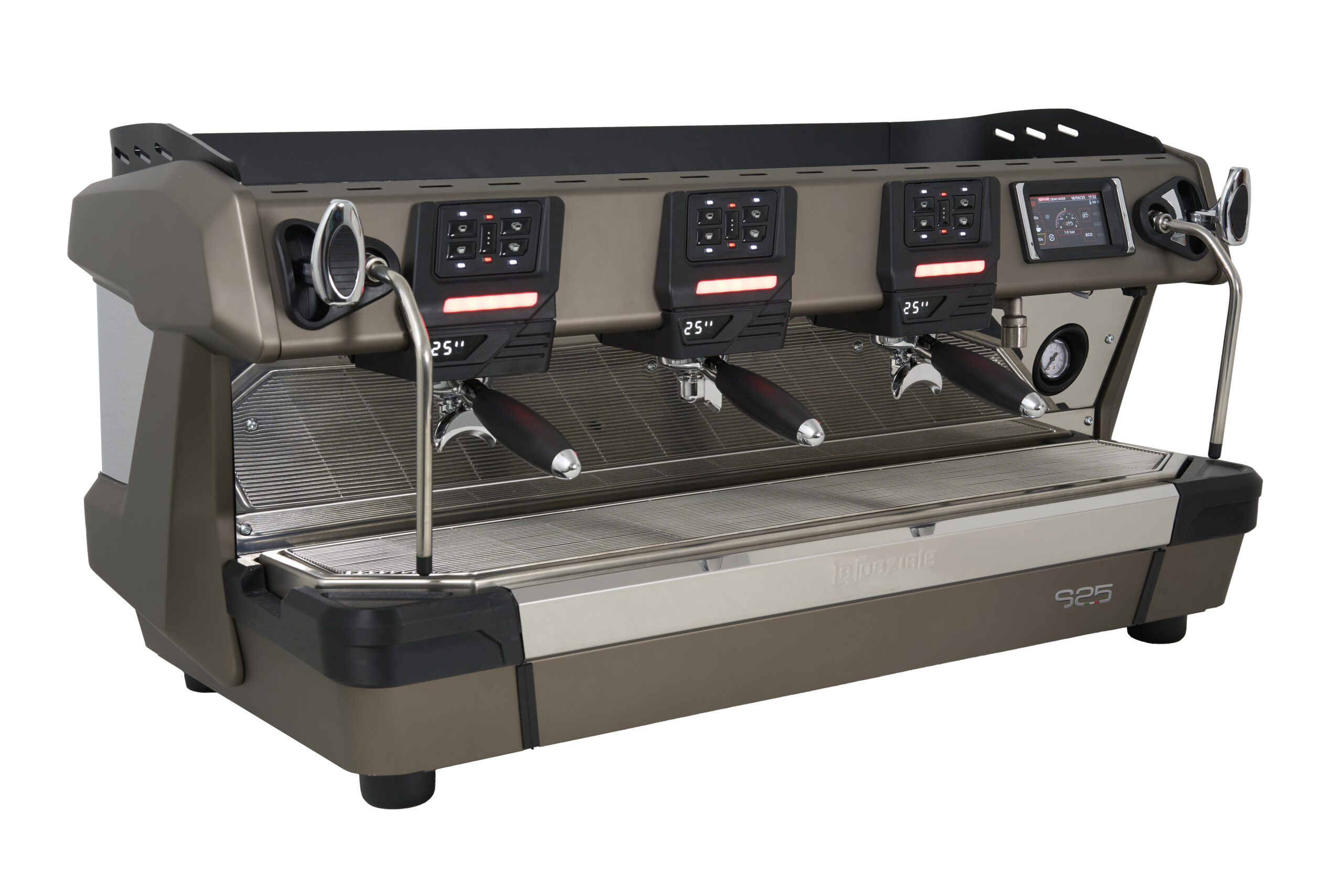 La prestigiosa marca italiana de máquinas de café profesionales aúna en la S25 elegancia y tecnología, con un diseño refinado y una pantalla táctil capacitiva de alta resolución. Situada sobre una amplia zona de trabajo, la interfaz de usuario es intuitiva y destaca por su practicidad y ergonomía.